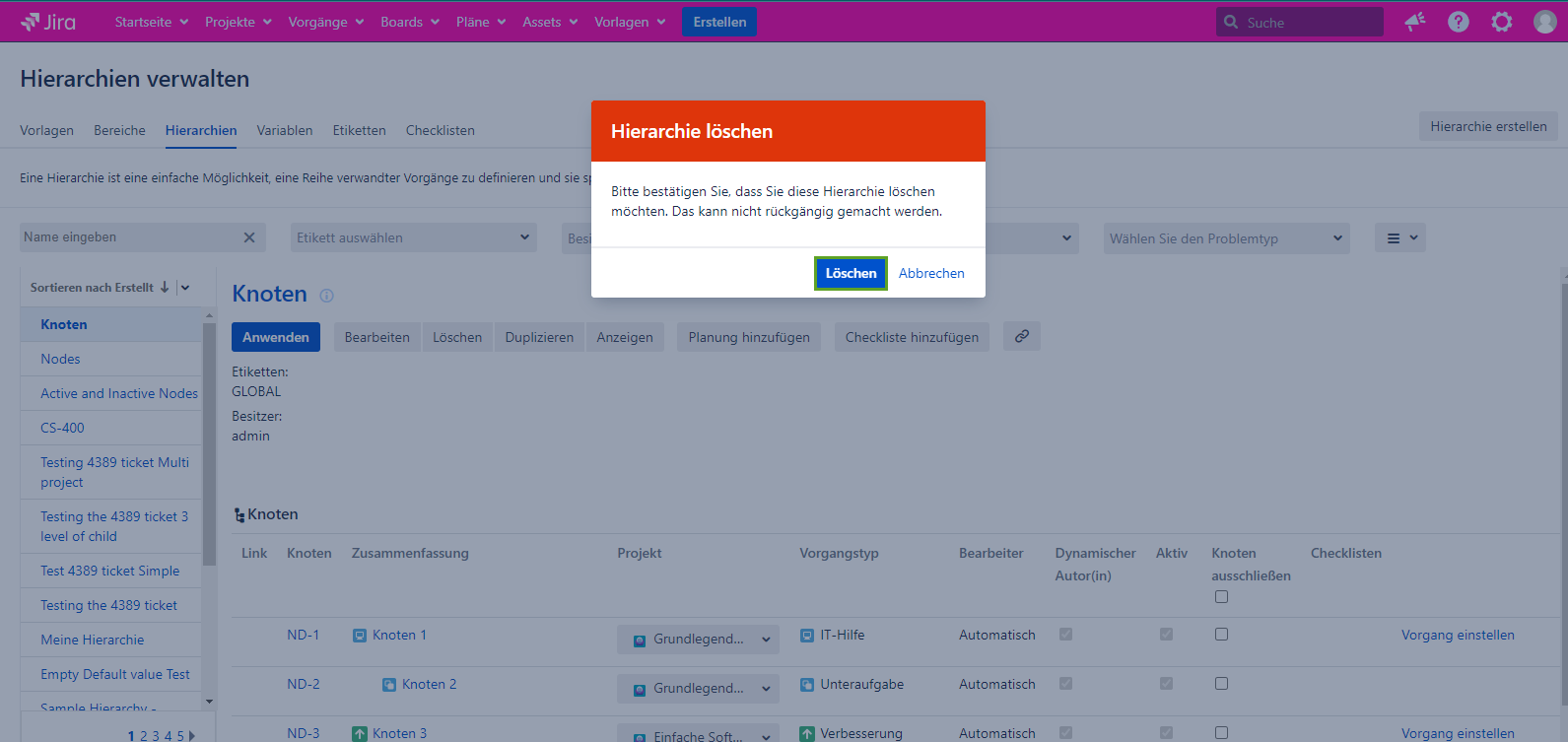 4. Bestätigen Sie Ihre Aktion zum Löschen der Hierarchie mit der Schaltfläche “Löschen” im Dialogfeld “Hierarchie löschen”.