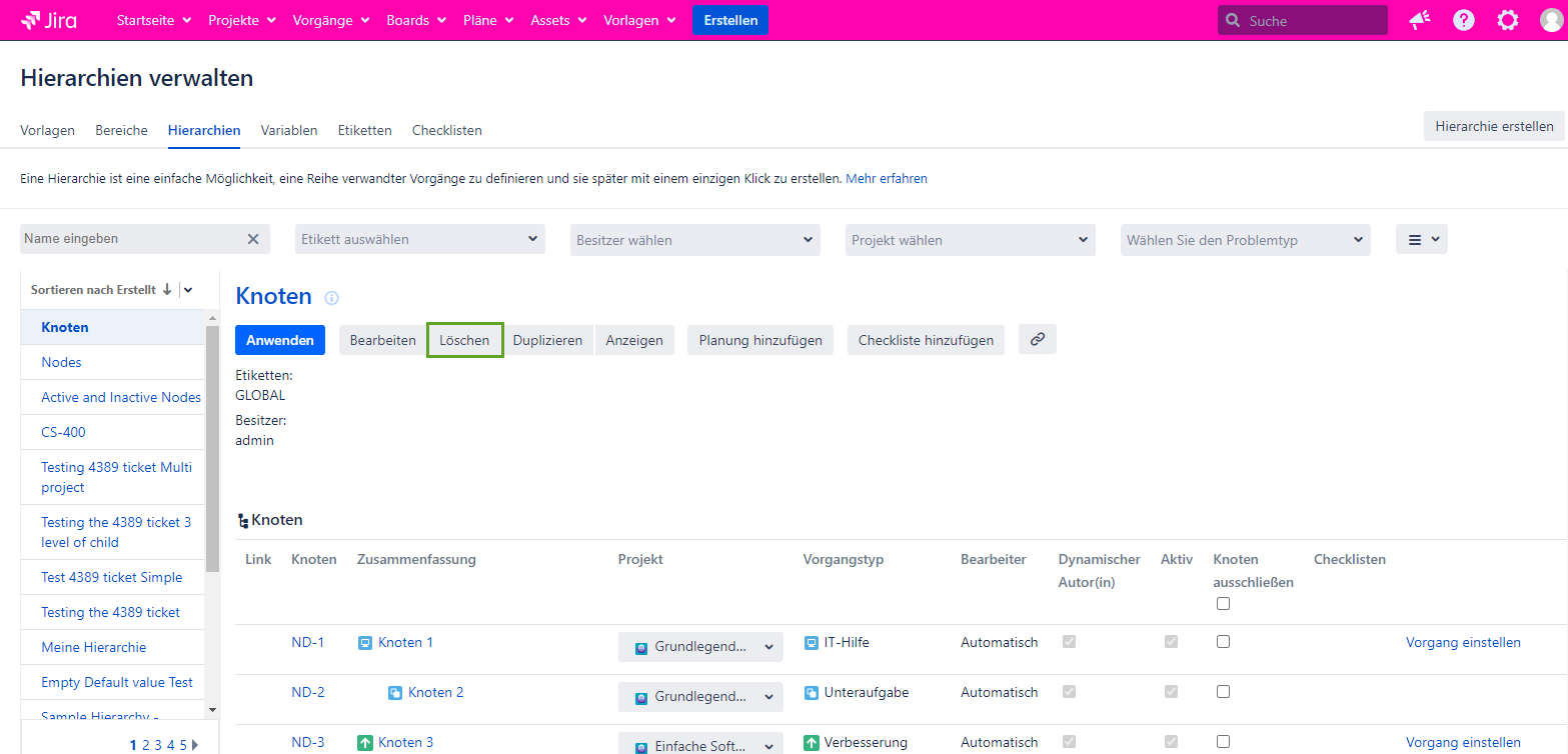 Klicken Sie auf der rechten Seite des Bildschirms direkt unter dem Hierarchienamen auf die Schaltfläche Löschen