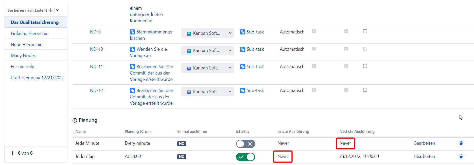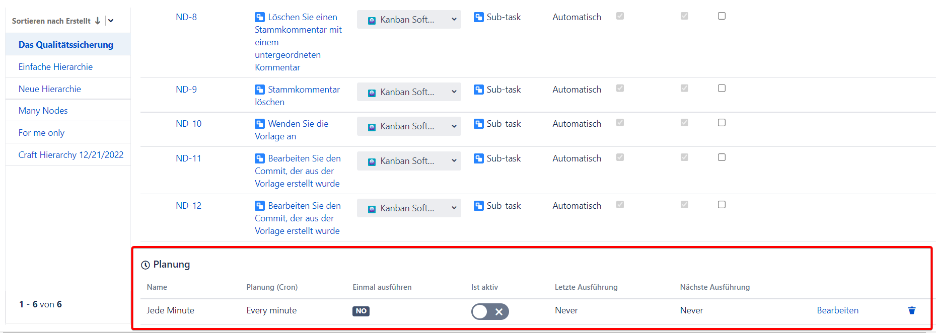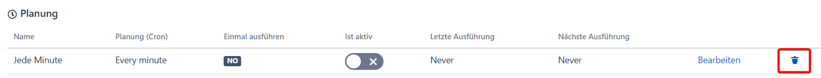 Sobald das Fenster geschlossen wird, sehen Sie Ihre neu erstellte Planung in der Liste aller Planungen. Dort erhalten Sie alle Informationen, die die Planung enthält, sowie Zugriff auf die Steuertaste „Ist aktiv“. Sie können die ausgewählte Planung jederzeit ein- und ausschalten.