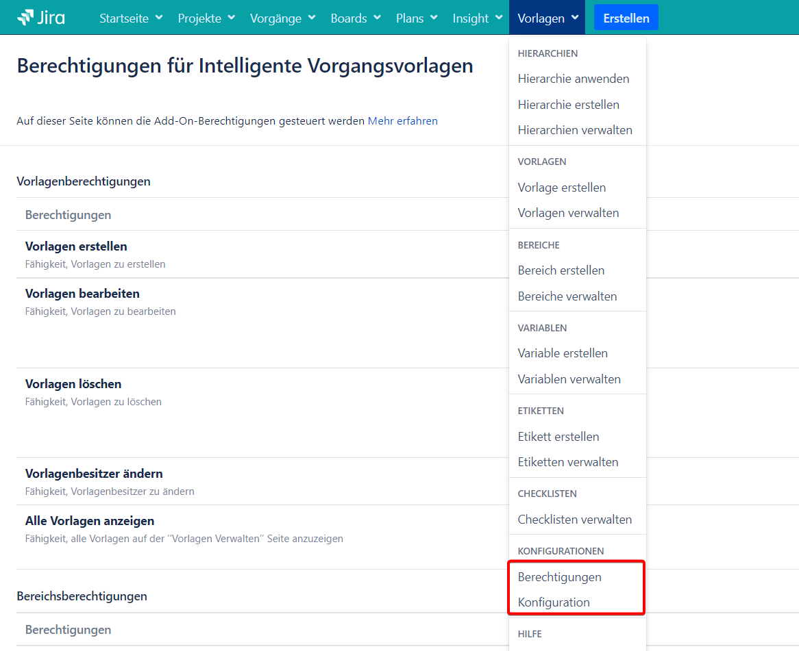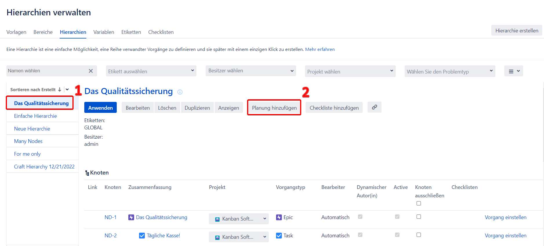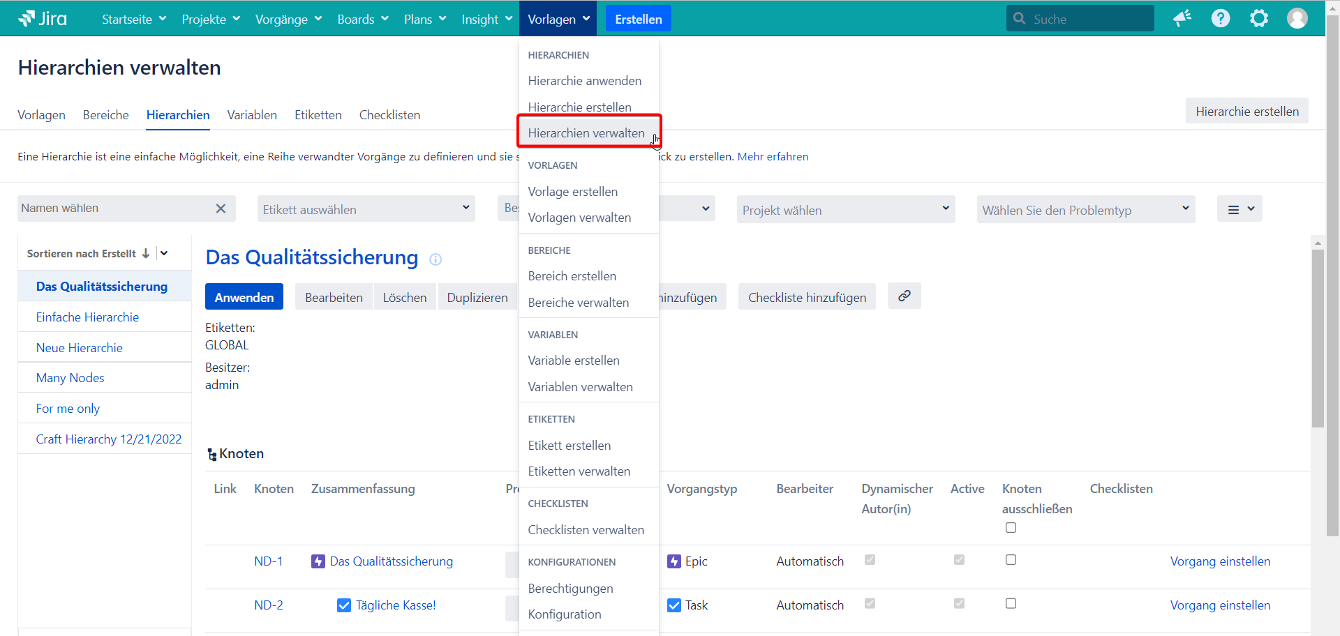 Um diese Funktion zu benutzen, müssen Sie in Jira auf die Registerkarte Vorlagen klicken und im Dropdown-Menü mit der Option „Hierarchien verwalten“ fortfahren.