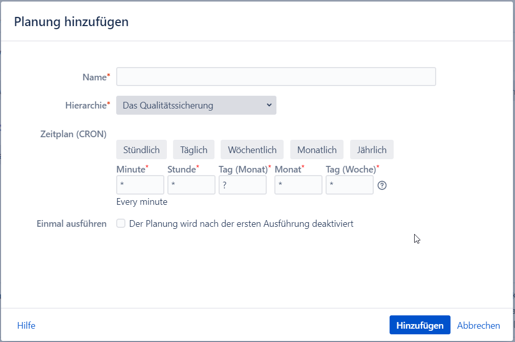Beachten Sie, dass Sie, wenn Sie Hilfe brauchen, um zu verstehen, was CRON ist, die Fragezeichen-Schaltfläche auf der rechten Seite der Zeitfelder drücken können. Wenn eine Hierarchie nur einmal im Zeitplan erstellt werden soll, können Sie auf das Kontrollkästchen "Einmal ausführen" klicken. Der Planer wird entfernt, sobald er verwendet wird.