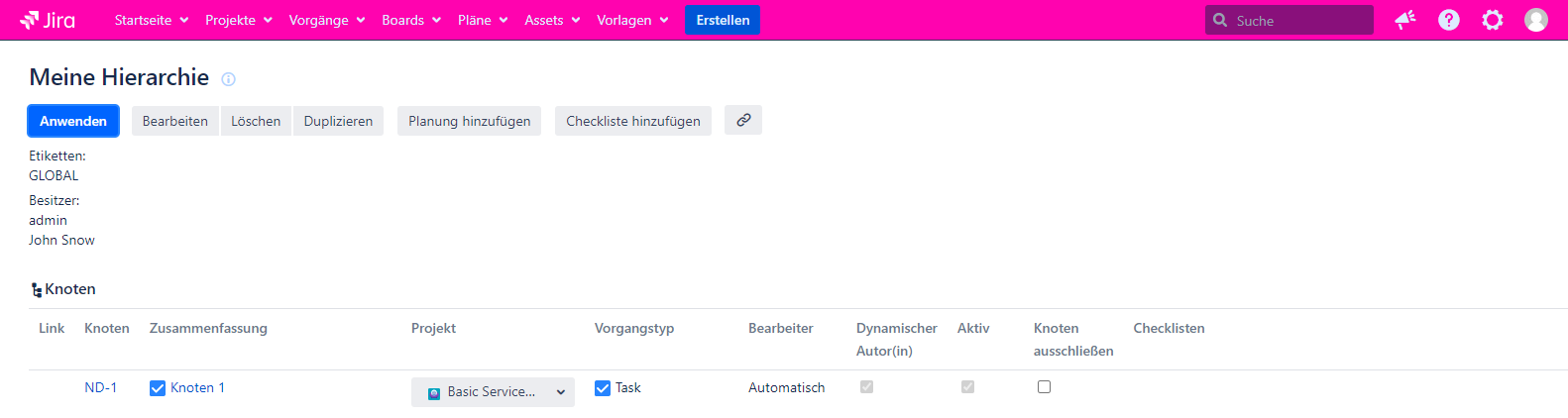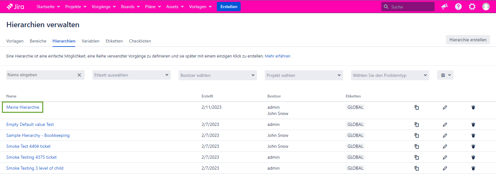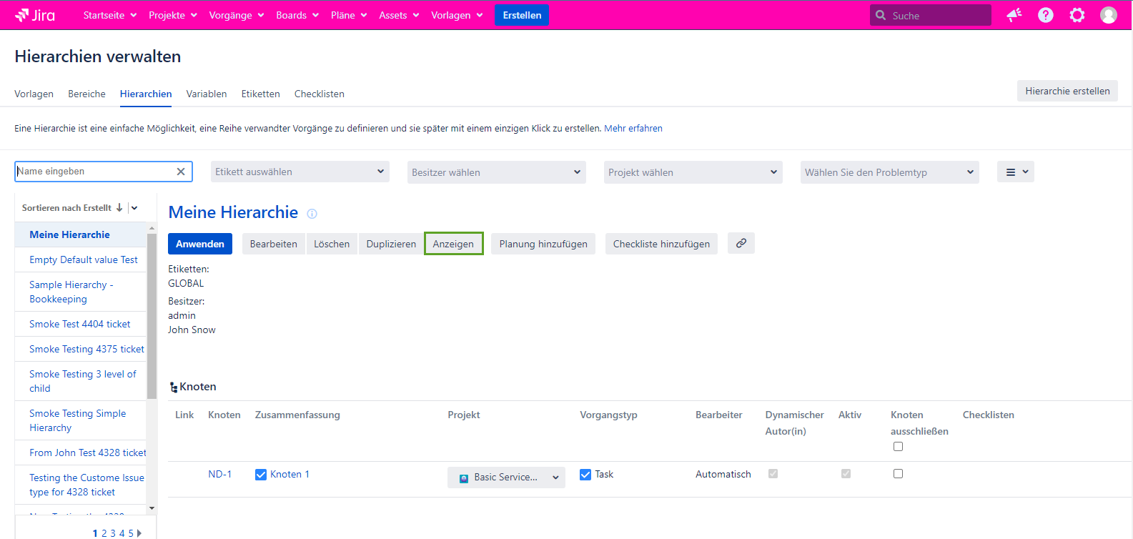Wenn Sie die Listenansicht für die Seite Hierarchien verwalten bevorzugen, müssen Sie auf den Hierarchienamen klicken, um die Seite hierarchie anzeigen zu öffnen. Es wird im neuen Tab geöffnet.