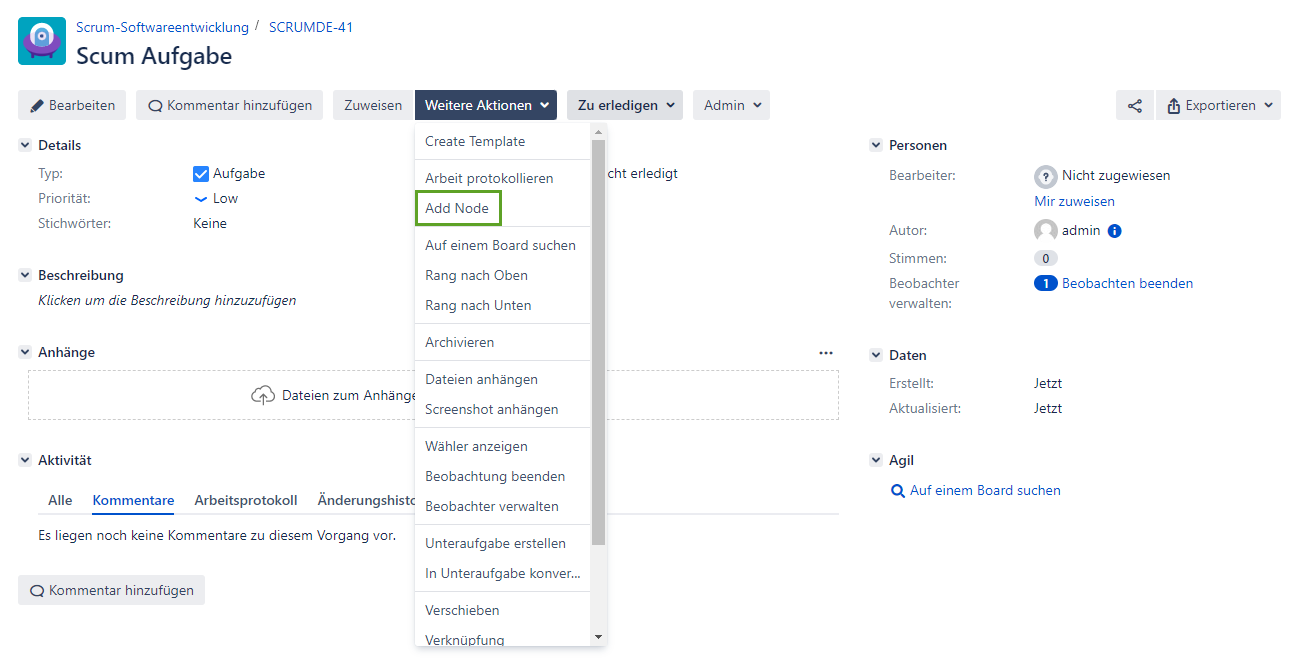 Um einen neuen Knoten von einem Problemansichtsbildschirm aus zu erstellen, müssen Sie das vorhandene Problem öffnen und auf das Dropdown-Menü Weitere Aktionen und dann auf die Option Add Node klicken.
