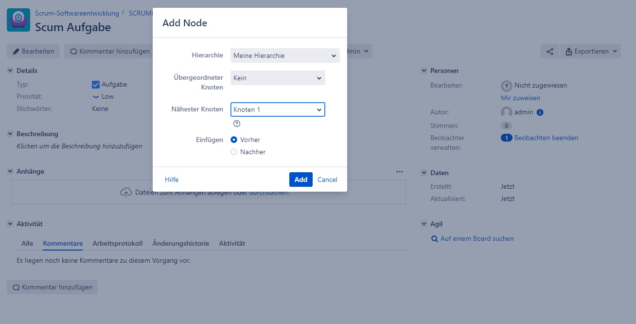 Wählen wir eine Hierarchie mit dem Namen Meine Hierarchie und platzieren unseren Knoten vorher Knoten 1. Es gibt keinen Übergeordneter Knoten, da das aktuelle Problem den Problemtyp Aufgabe hat und wir kein Epic in der aktuellen Hierarchie haben.