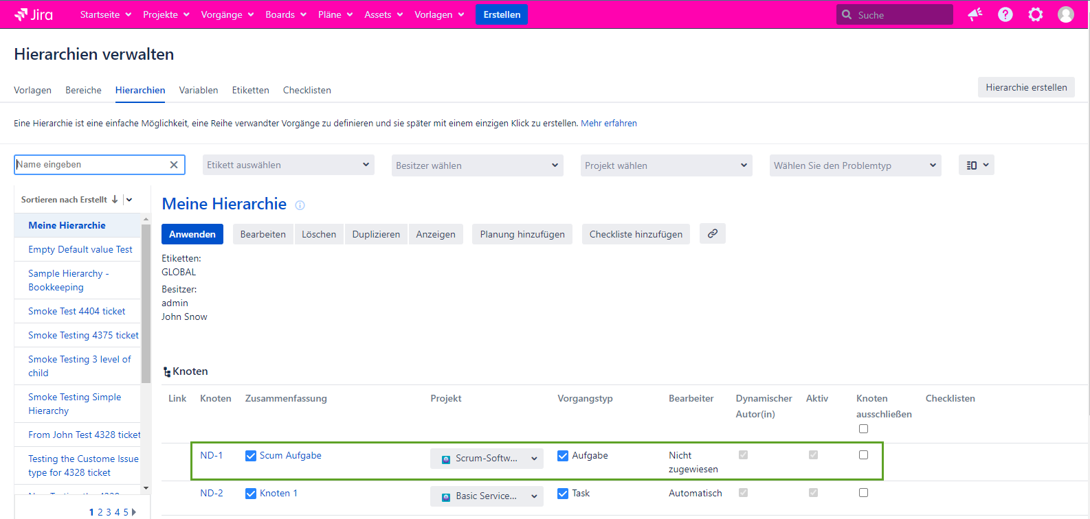 Sobald Sie auf die Schaltfläche Hinzufügen in der Fußzeile des Dialogfelds Knoten hinzufügen klicken, wird die Hierarchie Meine Hierarchie aktualisiert. Sie können sehen, dass der neue Knoten in der Hierarchie Meine Hierarchie erstellt wurde und vor dem Knoten 1 platziert wird, wie er ausgewählt wurde. Der Knotenname wurde standardmäßig aus der Problemzusammenfassung übernommen.