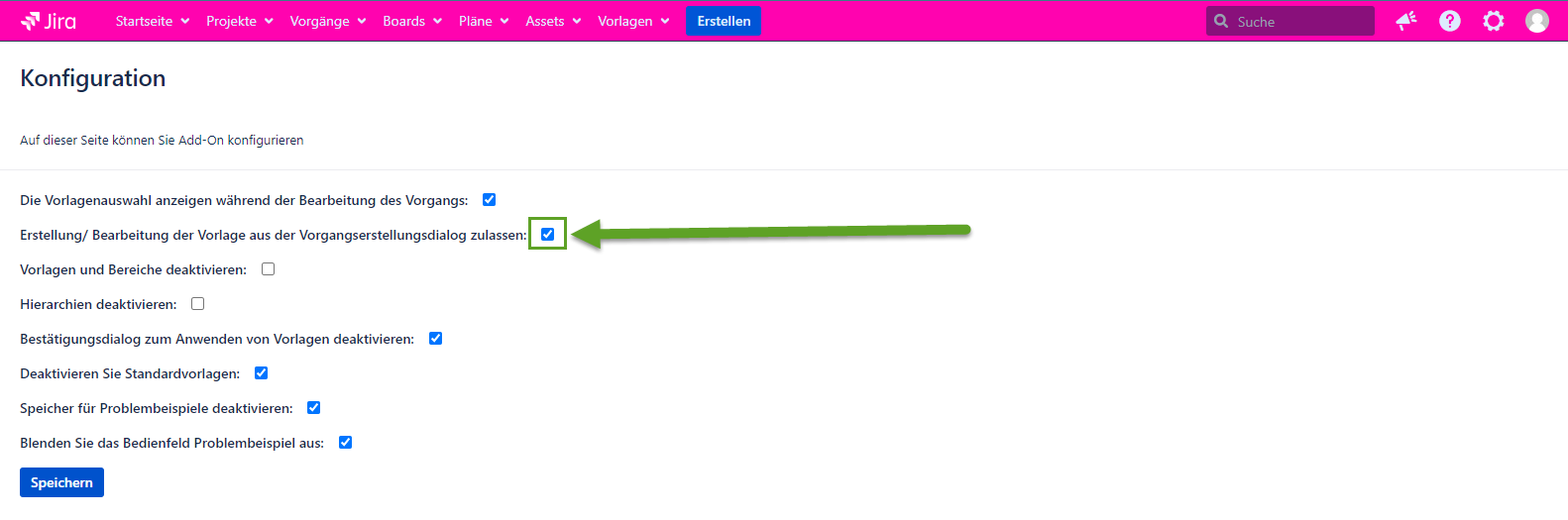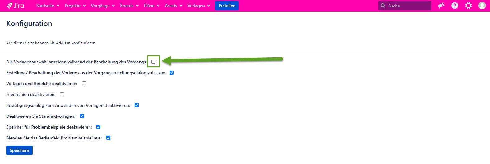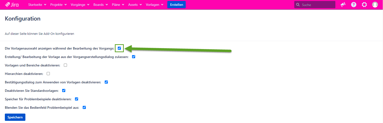 Wenn die Konfiguration markiert ist, erscheint die Vorlagenauswahl wie gewohnt im Dialogfeld Vorgang bearbeiten. Wenn die Konfiguration nicht markiert ist, wird die Vorlagenauswahl nicht mehr im Dialogfeld Vorgang bearbeiten angezeigt.