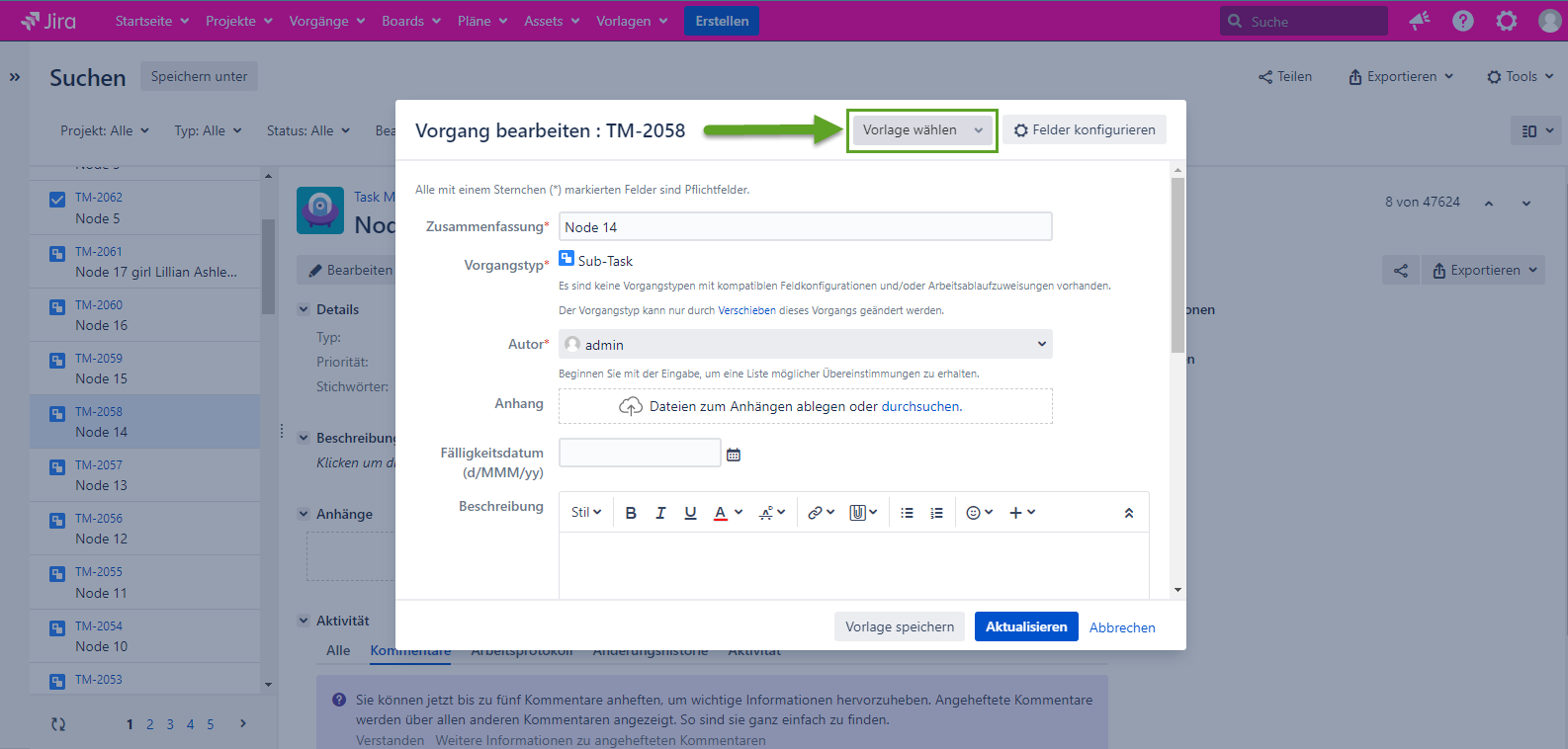 Die Vorlagenauswahl anzeigen während der Bearbeitung des Vorgangs