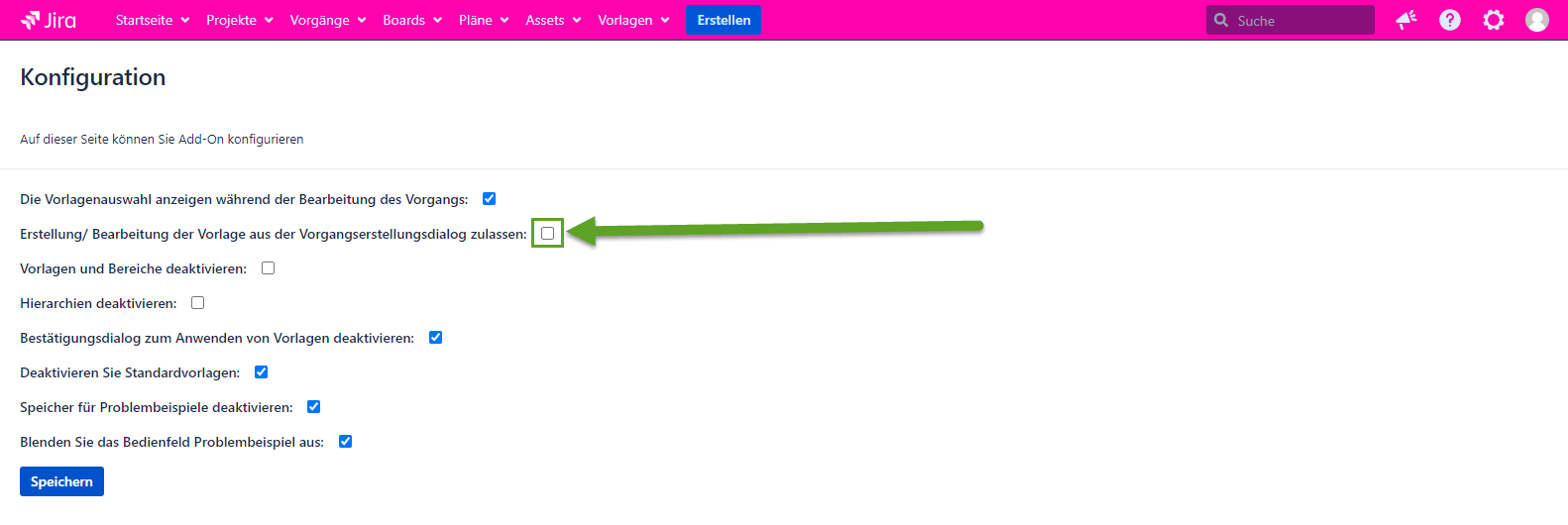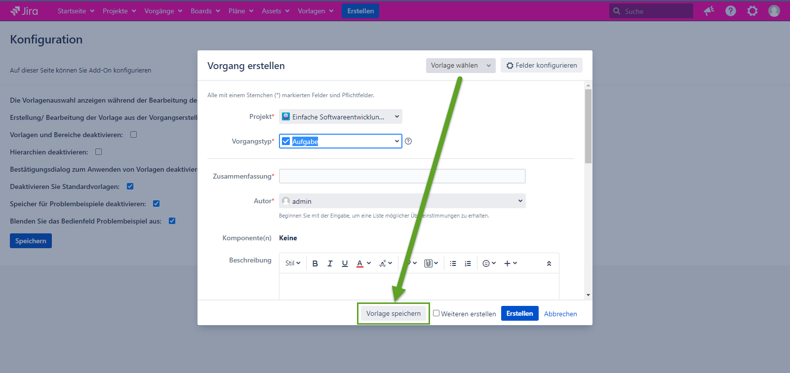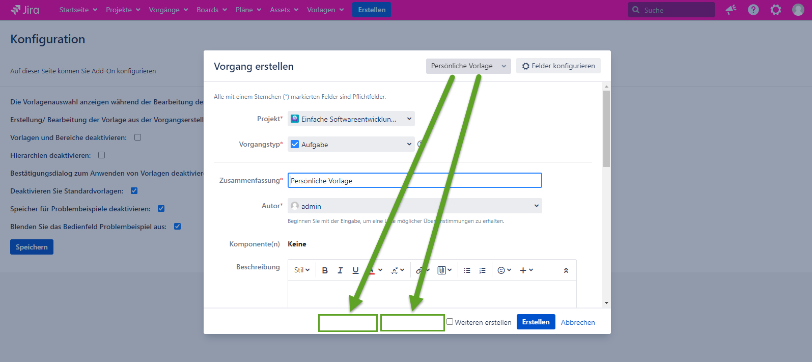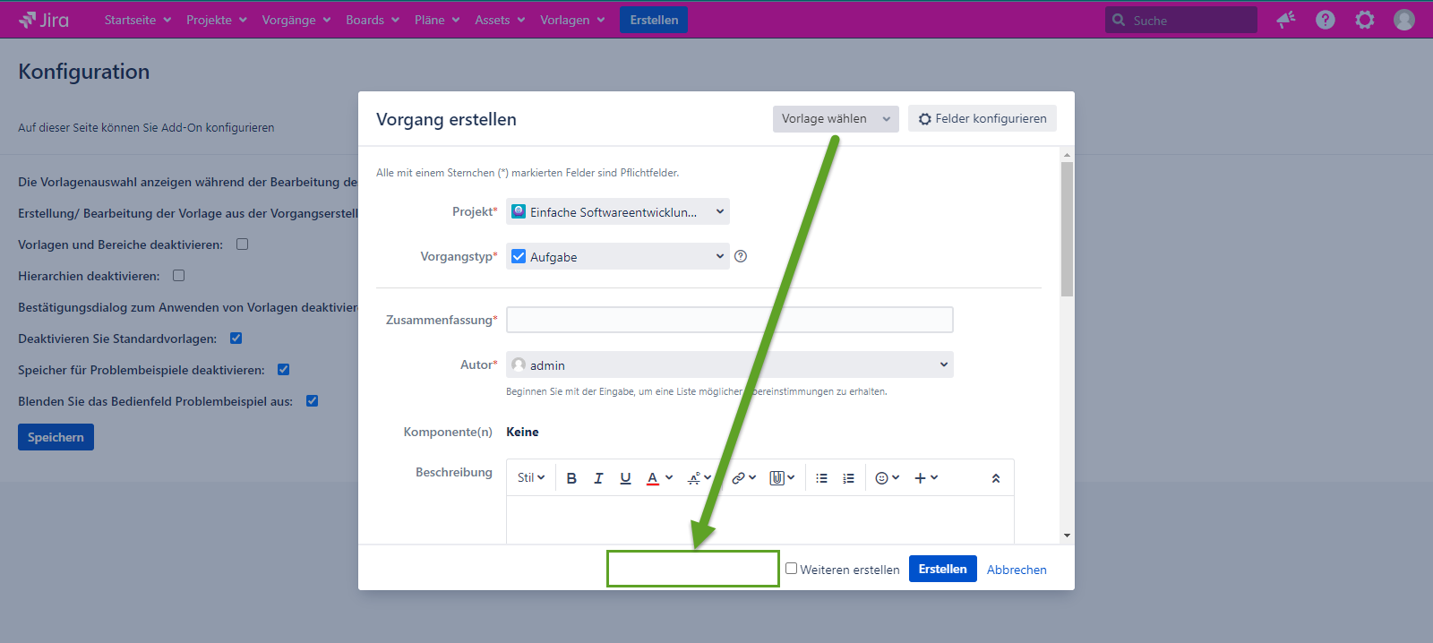 Wenn die Konfiguration markiert ist, ist es möglich, eine Vorlage im Vorgang erstellen Dialog zu bearbeiten/erstellen. Wenn die Konfiguration nicht markiert ist, ist die Möglichkeit zum Erstellen/Bearbeiten von Vorlagen im Dialogfeld Vorgang erstellen nicht mehr verfügbar.