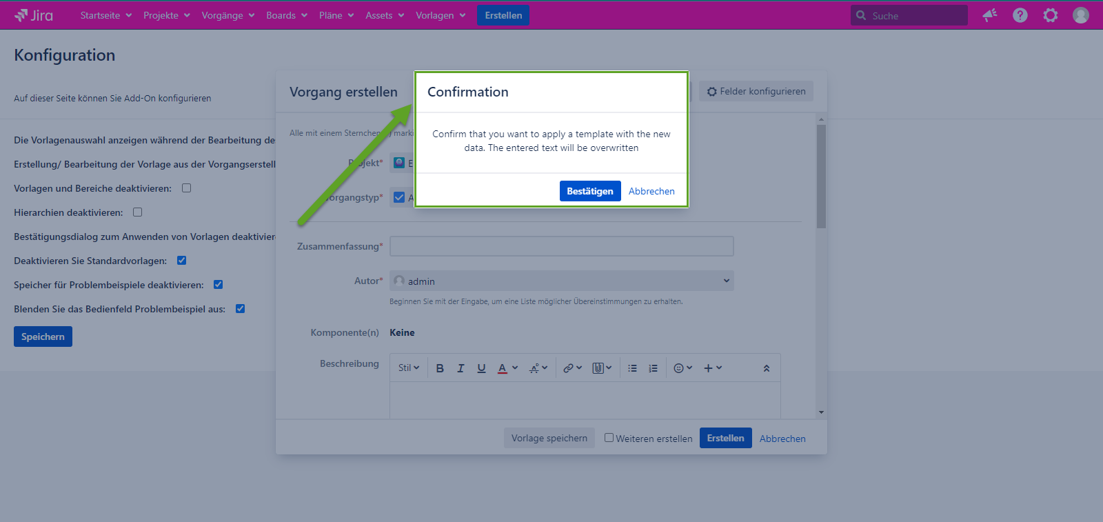 Das Bestätigungsdialogfeld wird nicht über dem Dialogfeld Vorgang erstellen geöffnet, nachdem die Vorlage in der Liste Vorlage wählen ausgewählt wurde, wenn die Konfiguration markiert ist. Wenn die Konfiguration nicht markiert ist, wird der Bestätigungsdialog wie gewohnt angezeigt.