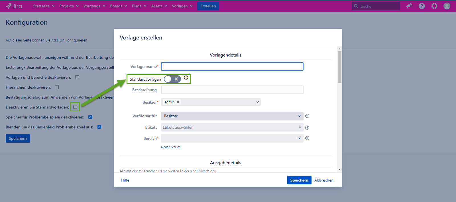 Falls es deaktiviert ist, wird der Umschalter Standardvorlage in den Dialogfeldern Vorlage erstellen und Vorlage bearbeiten angezeigt.