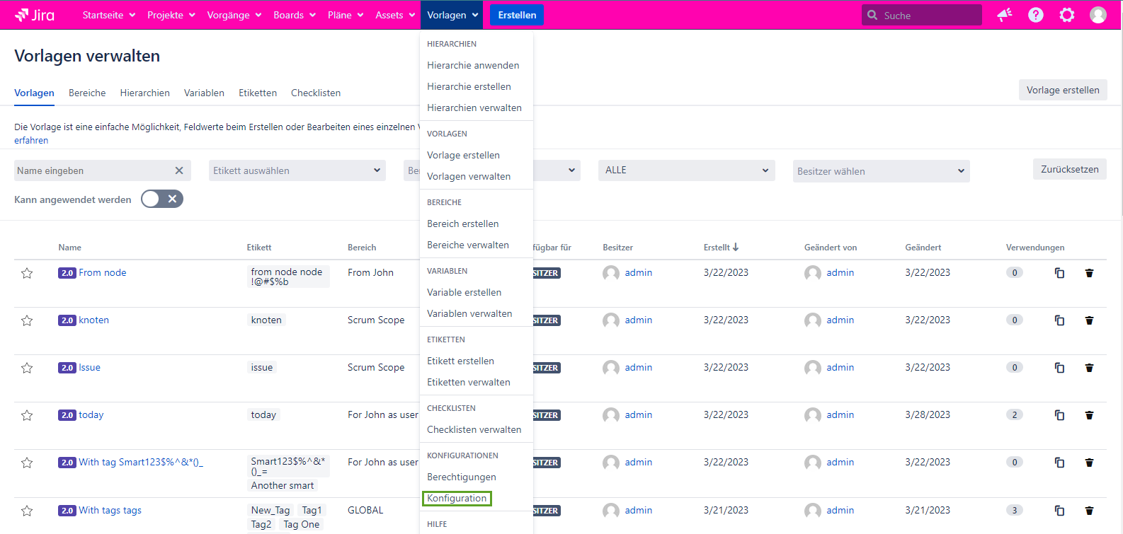 Konfiguration ist eine Funktion, die für die Verwaltung von Add-On-Einstellungen erstellt wurde. Die Konfiguration befinden sich im Dropdown-Liste Vorlagen → KONFIGURATIONEN Abschnitt.