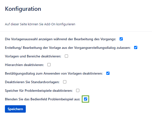 Falls Sie das Problemmuster-Bedienfeld auf dem Problemansichtsbildschirm nicht benötigen, aber die Möglichkeit haben möchten, es später zu aktivieren und zu überprüfen, welche Hierarchien zum Auffüllen einiger Probleme verwendet wurden, können Sie einfach die Option Blenden Sie das Bedienfeld Problembeispiel aus aktivieren die Konfigurationsseite.