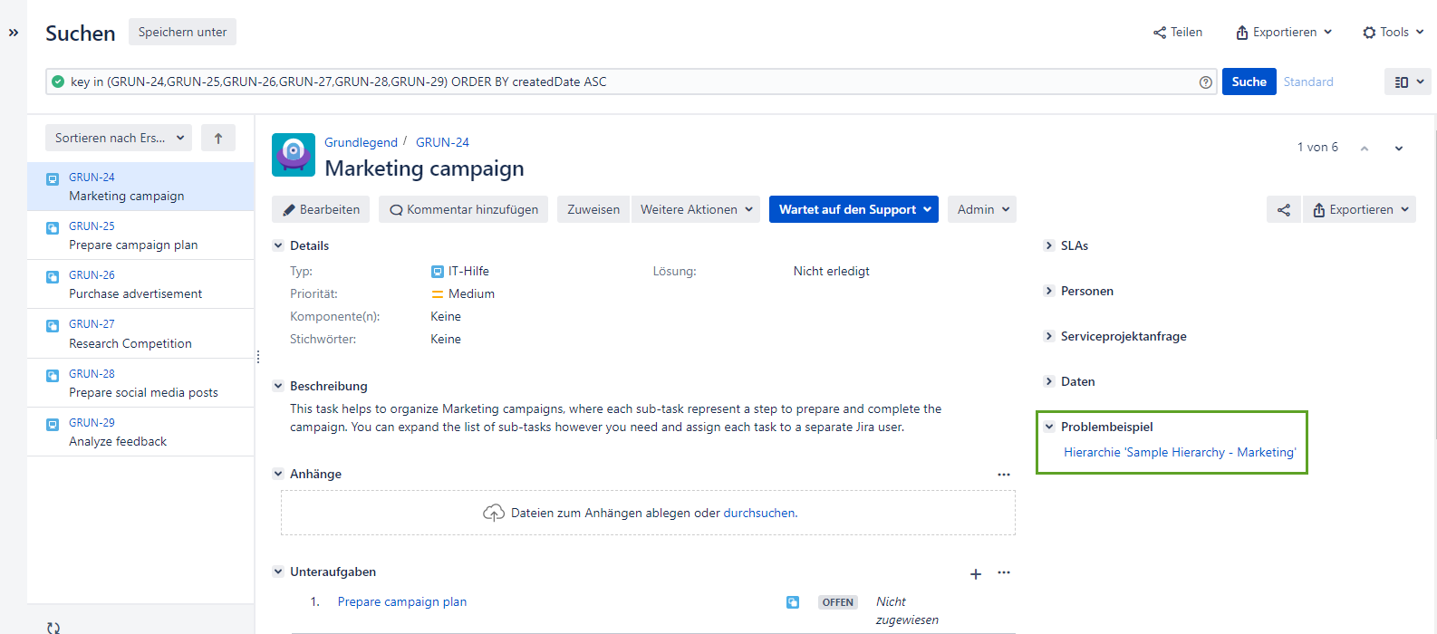 Sobald Sie das Feld Blenden Sie das Bedienfeld Problembeispiel aus deaktivieren, sehen Sie den Hierarchienamen wieder auf der Issue-Ansichtsseite.