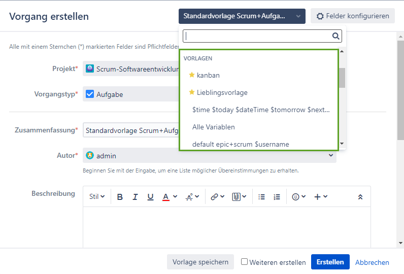 Die Funktion Standardvorlage bewirkt, dass die Vorlage sofort angewendet wird, wenn eine eindeutige Kombination aus Jira-Projekt und Vorgangstyp ausgewählt wird und die Standardvorlage basierend auf dieser spezifischen Kombination vom Kunden erstellt wird: