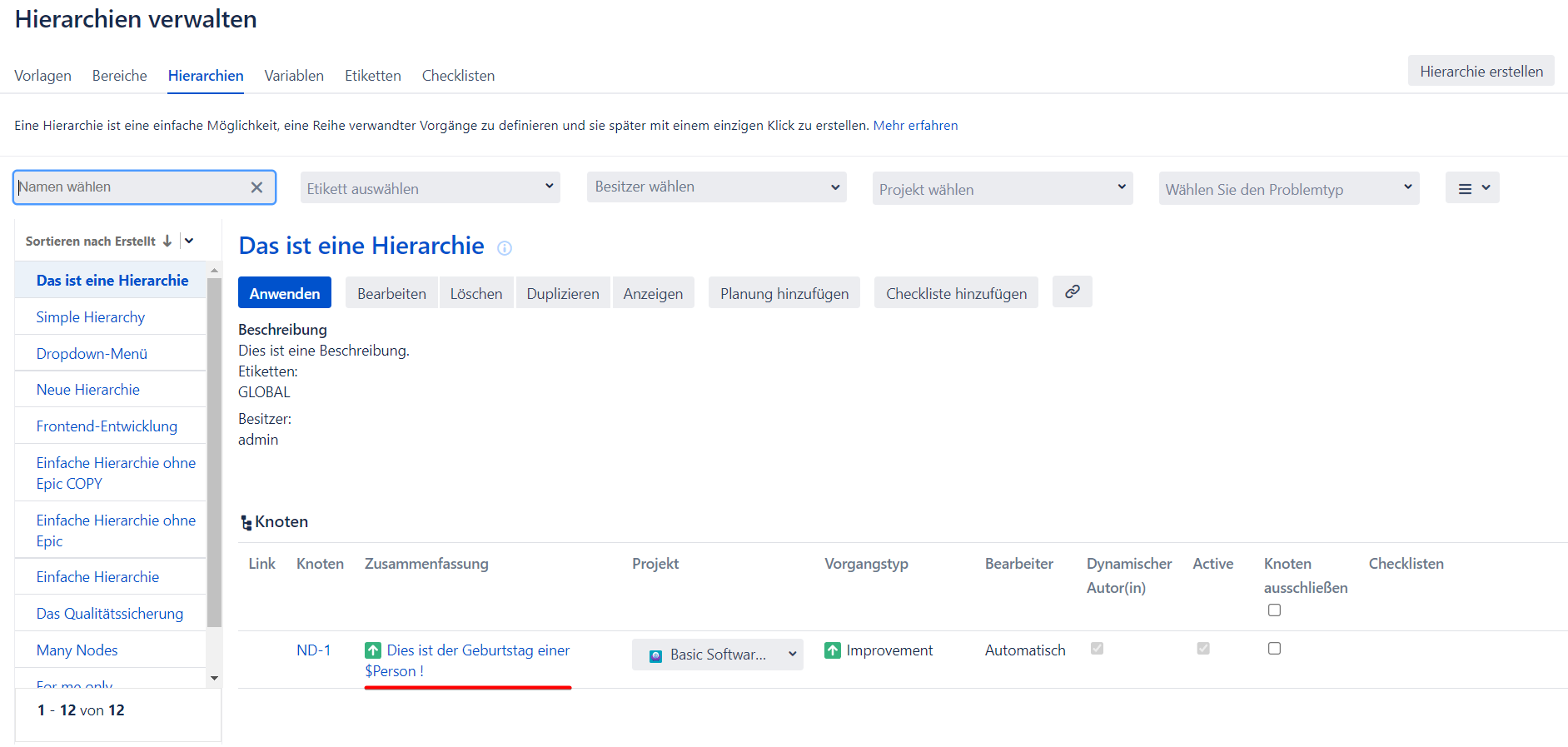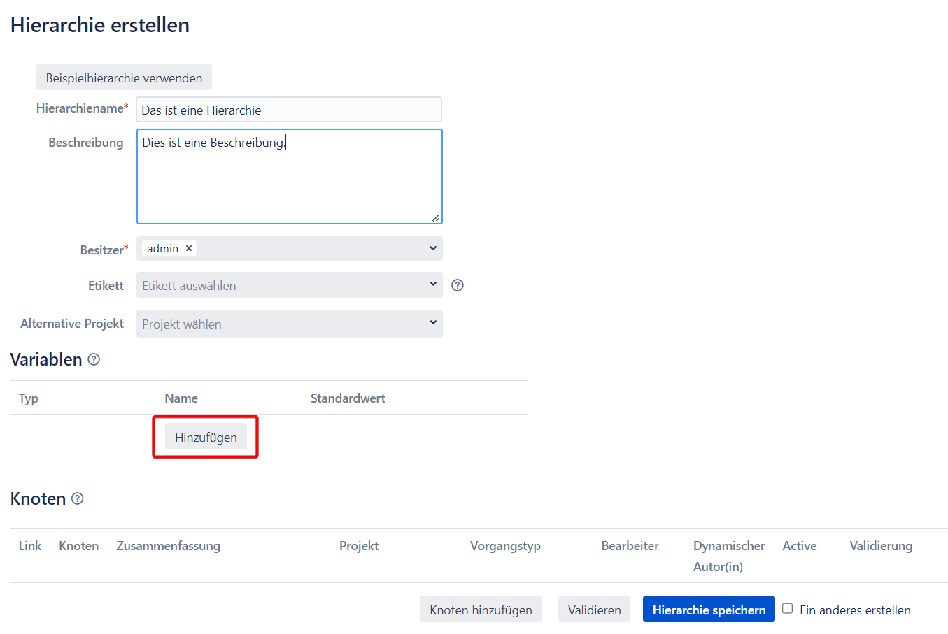 Um diese Funktion nutzen zu können, müssen Sie entweder beim Erstellen einer Hierarchie oder im Abschnitt "Hierarchien verwalten" der Intelligenten Vorgangvorlagen Variablen setzen. In diesem Leitfaden werden wir beide Optionen behandeln und mit - der Erstellung einer Hierarchie - beginnen. In diesem Leitfaden geht es um die Verwendung der Variablen. Wenn Sie also mit der Erstellung von Hierarchien Schwierigkeiten haben, lesen Sie bitte dieses Benutzerhandbuch.