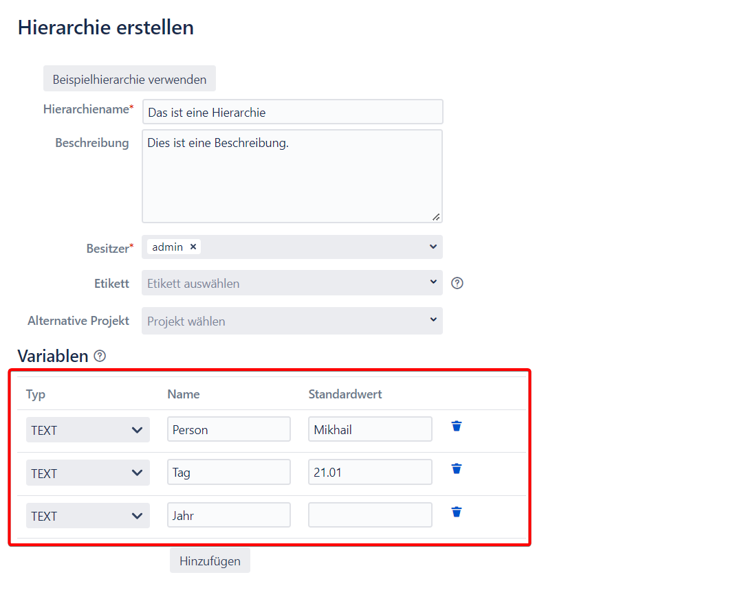 Benutzertyp- lässt zu einen Benutzer auszuwählen. Sie können diese Variable mit dem Bearbeiter oder Autor benutzen, um diesen Benutzer auf dieses Feld einzustellen. Nur die Benuzer benutzen, die auf das Projekt zugreifen können, für das die Hierarchie benutzt wird. Sonst bekommen Sie eine Nachricht, dass dieser Benutzer in Feldern Bearbeiter oder Autor nicht benutzt werden kann. Sie können das auch mit jedem Textfeld benutzen, falls es den Anzeigenamen des Benutzers eingibt.