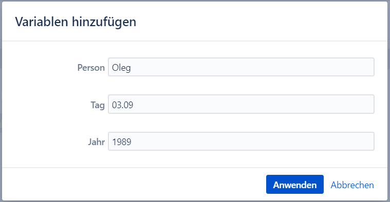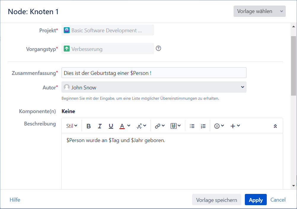 Variablen treiben den Automatisierungsprozess der Jira-Vorgangerstellung mit Intelligenten Vorgangvorlagen noch weiter voran. Variablen sind Platzhalter, die automatisch mit vorkonfigurierten Daten gefüllt werden, die die Vorgänge enthalten müssen.