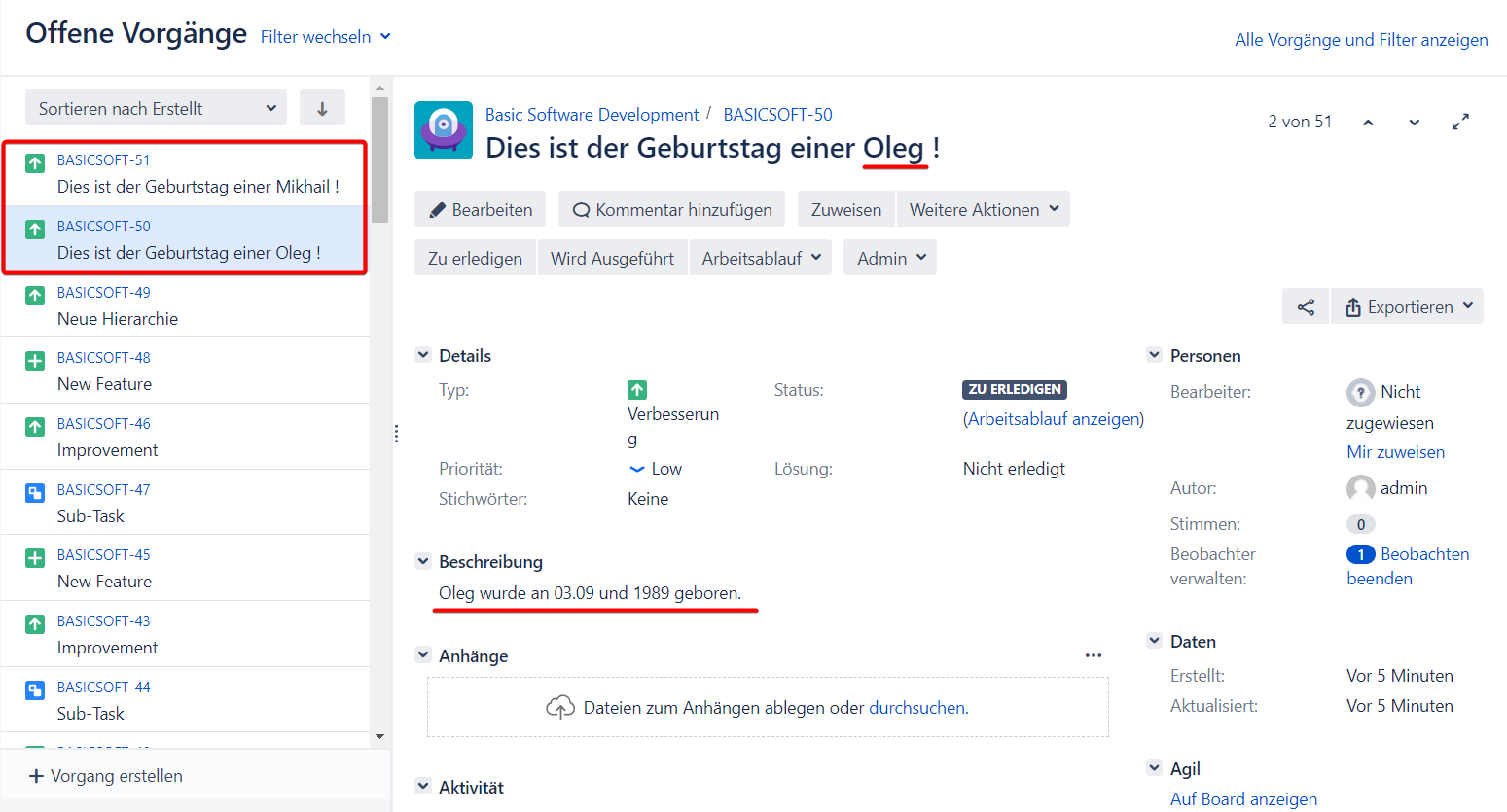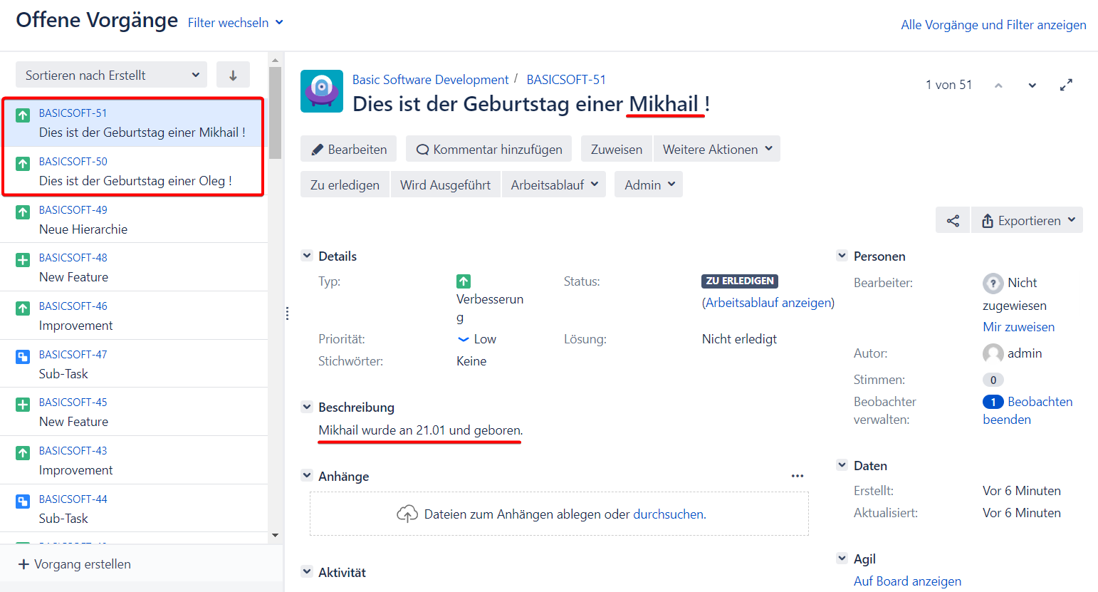 Wir wussten Mikhails Geburtsjahr nicht, weshalb an der Stelle, an der die Variable stand, eine Leerstelle ist, was jedoch bei der Geburtstagserinnerung von Oleg nicht der Fall ist.