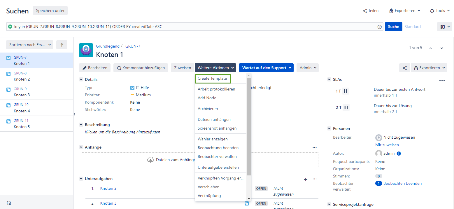 Sie können auch eine neue Vorlage auf der Seite Problemansicht erstellen, indem Sie auf die Schaltfläche Weitere Aktionen klicken und das Element Vorlage erstellen auswählen.