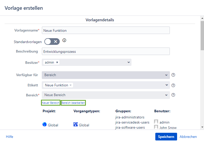Bereich * | Schränkt die Sichtbarkeit der Vorlage ein. Die Vorlage ist nur in Projekten und Problemtypen verfügbar, die im Geltungsbereich für jeden Benutzer angegeben sind, der Zugriff auf Projekte hat, die im Geltungsbereich aufgeführt sind, und für die Gruppenmitglieder, die im Geltungsbereich definiert wurden. |