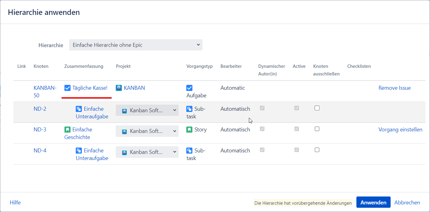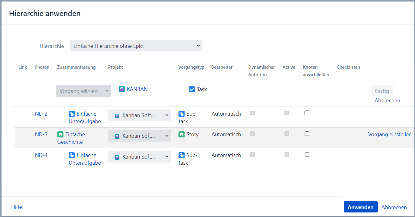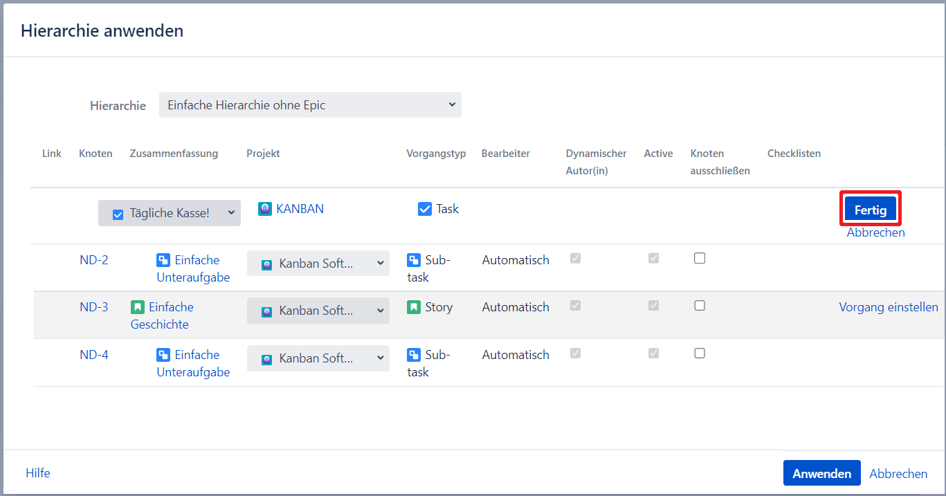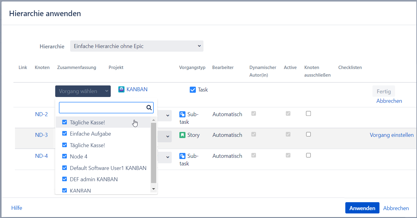 Im geöffneten Fenster wählen Sie die Hierarchie, die Sie verwenden möchten, und ganz rechts auf dem Bildschirm können Sie auf die Schaltfläche "Vorgang festlegen" klicken.