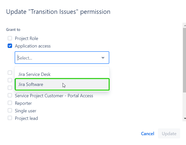 Select ‘Update’ > ‘Application access’ >'Jira Software