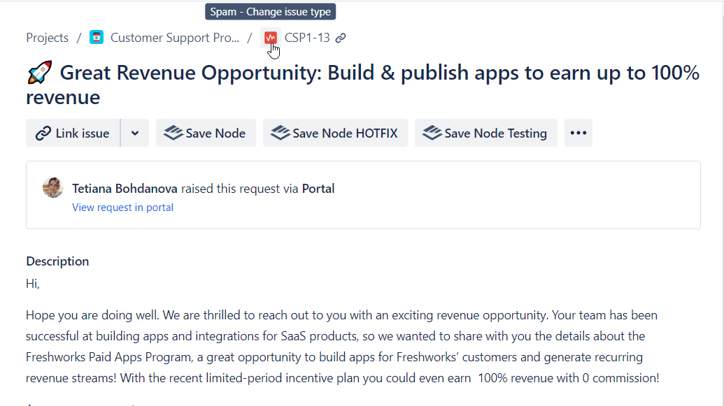 The new 'Spam' issue type is now integrated into your Jira Service Management project. If spam-like traits are detected in a request, the system will auto-switch the original issue type to 'Spam'.