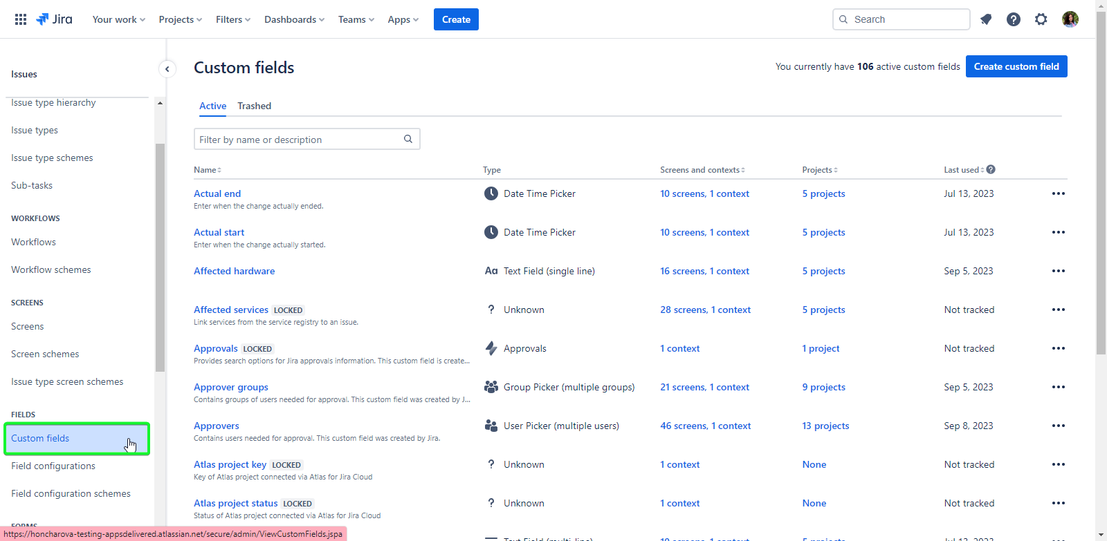 Choose the 'Custom fields' option from the menu.