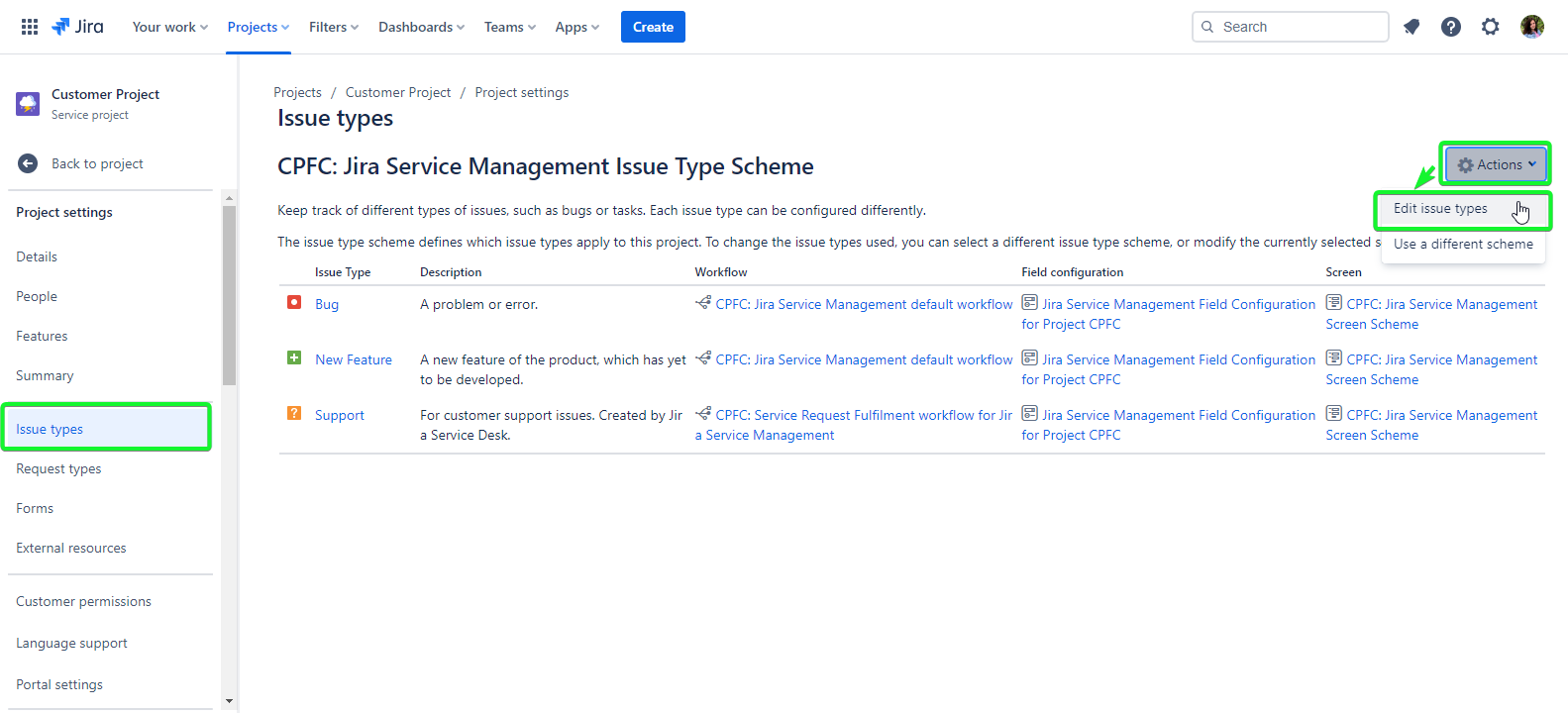 In the ‘Issue Types' section, click on the ‘Actions’ button, and on the dropdown click on 'Edit issue types’.