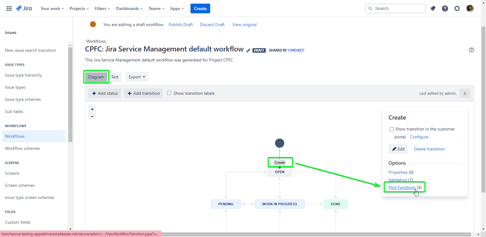 Select the transition between workflow steps where you want to activate spam detection. Using the transition that occurs immediately after an issue is created is recommended.