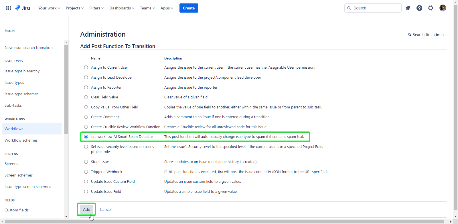 Choose the 'AI Smart Spam Detector' post function from the list of Jira workflow functions, and click the 'Add' button.
