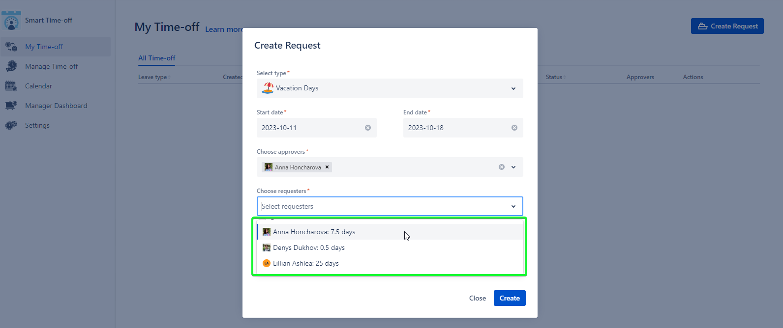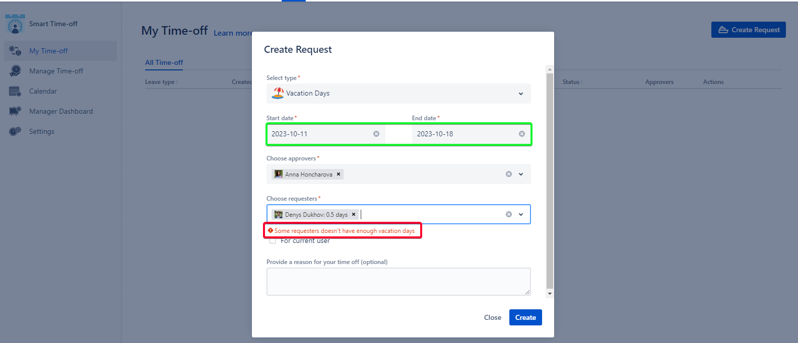 Now the Manager Dashboard is disabled for specific users and users can create requests without excluding the available vacation days per year.