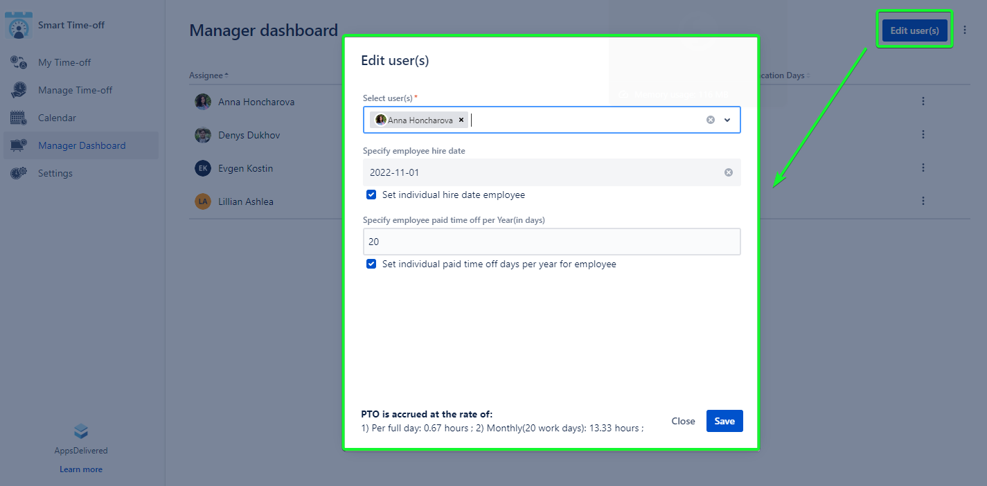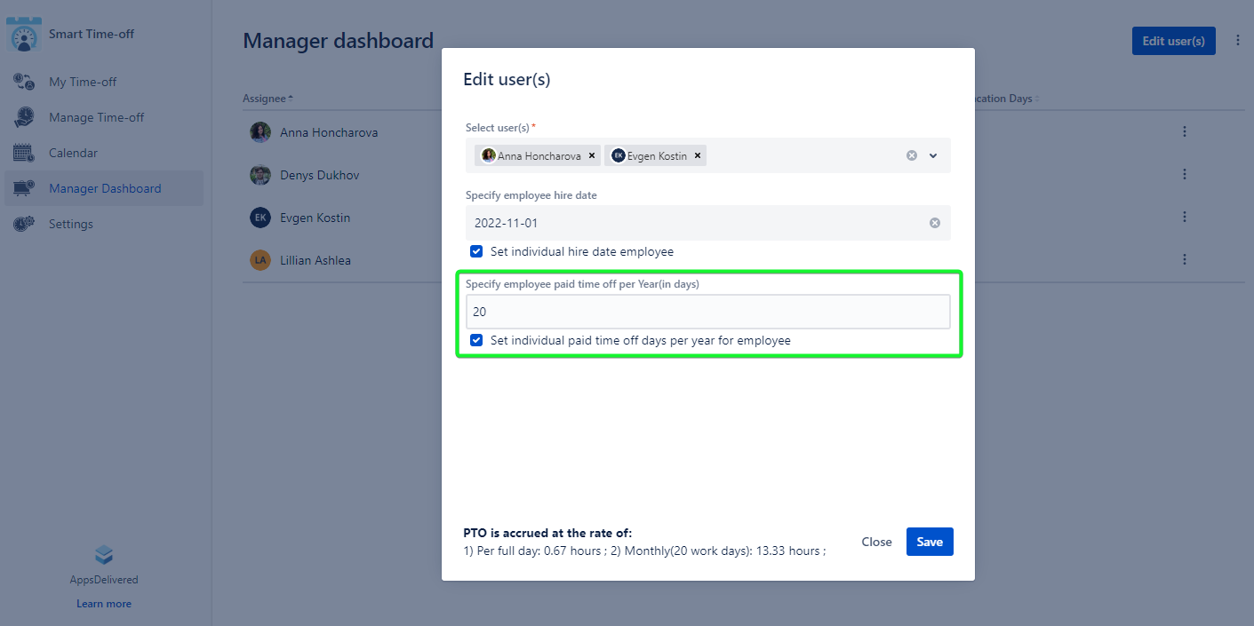 🎯 Customize Individual Starting Dates: Tailor the countdown initiation for accumulating vacation days for selected users.