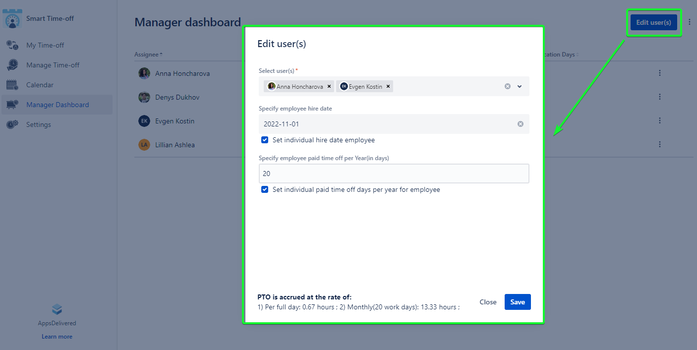 or you can set the starting date and the number of global vacation days allocated per year for some users and specify unused days per year in the ‘Edit users’ dialog in the Manager Dashboard page.