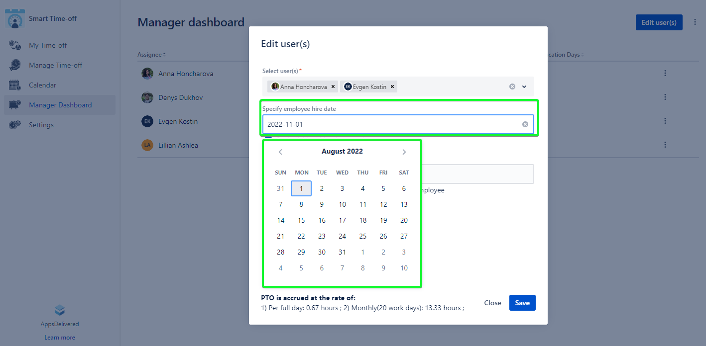 Select the hire date for all users(you can specify it for each user on the Manager Dashboard page)