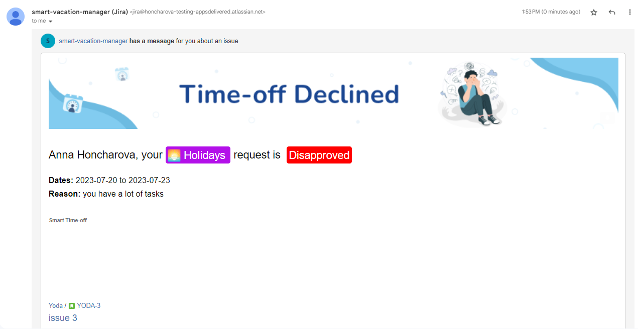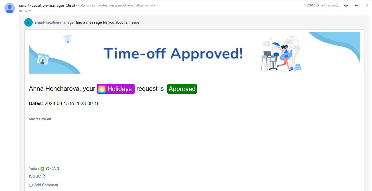 The E-mail Integration feature allows users of the Smart Time-Off App to seamlessly communicate and notify approvers about their time-off requests. Additionally, the requesters are informed about the status of their request (whether approved or declined) through e-mail.
