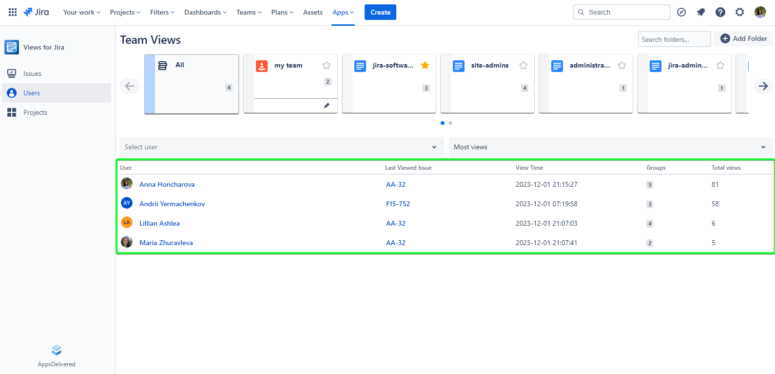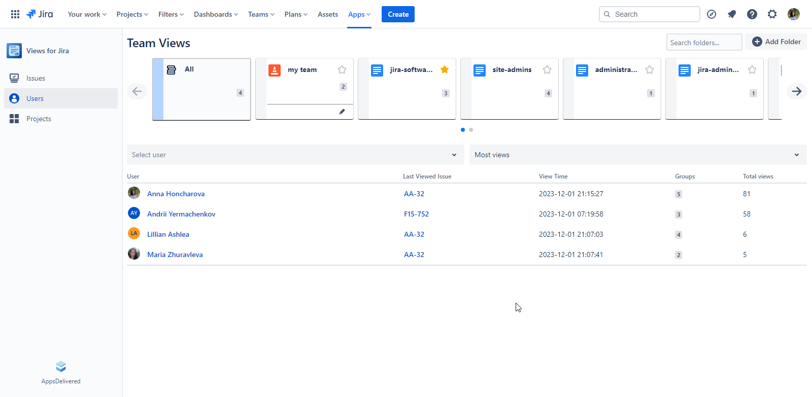 All Folder: This displays a collective view count for user groups within the Jira instance, whose users have issue views.