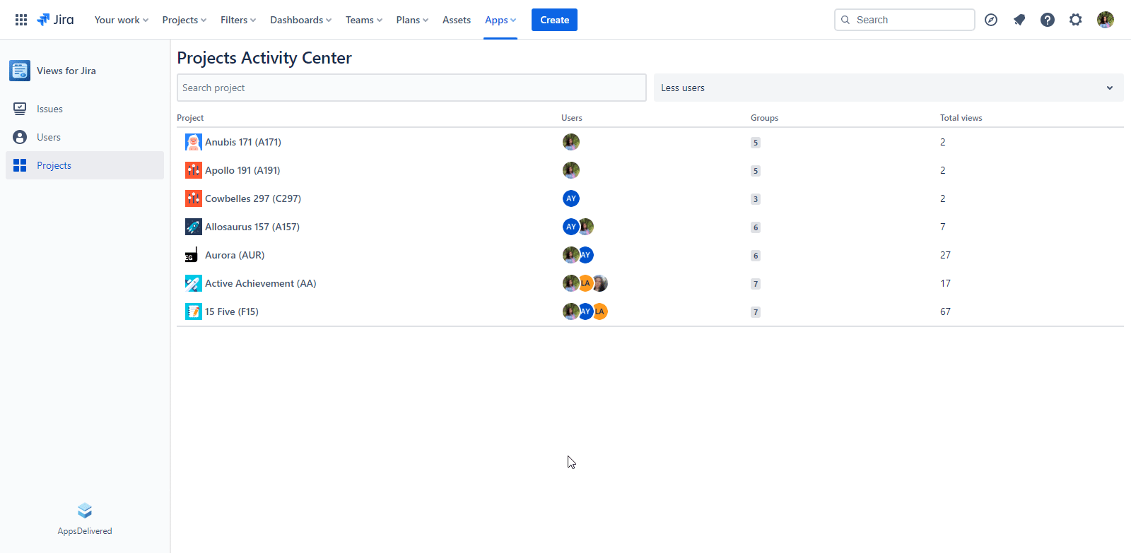 The 'Projects Activity Center' is a hub for tracking the engagement levels of different projects within Jira. It displays a snapshot of the views each project has received.