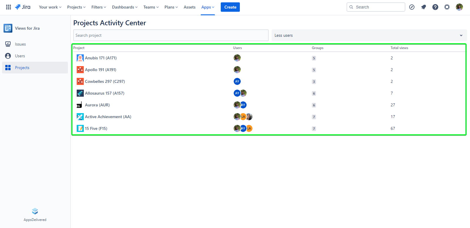 Users: Shows avatars of users who have viewed issues for each project.