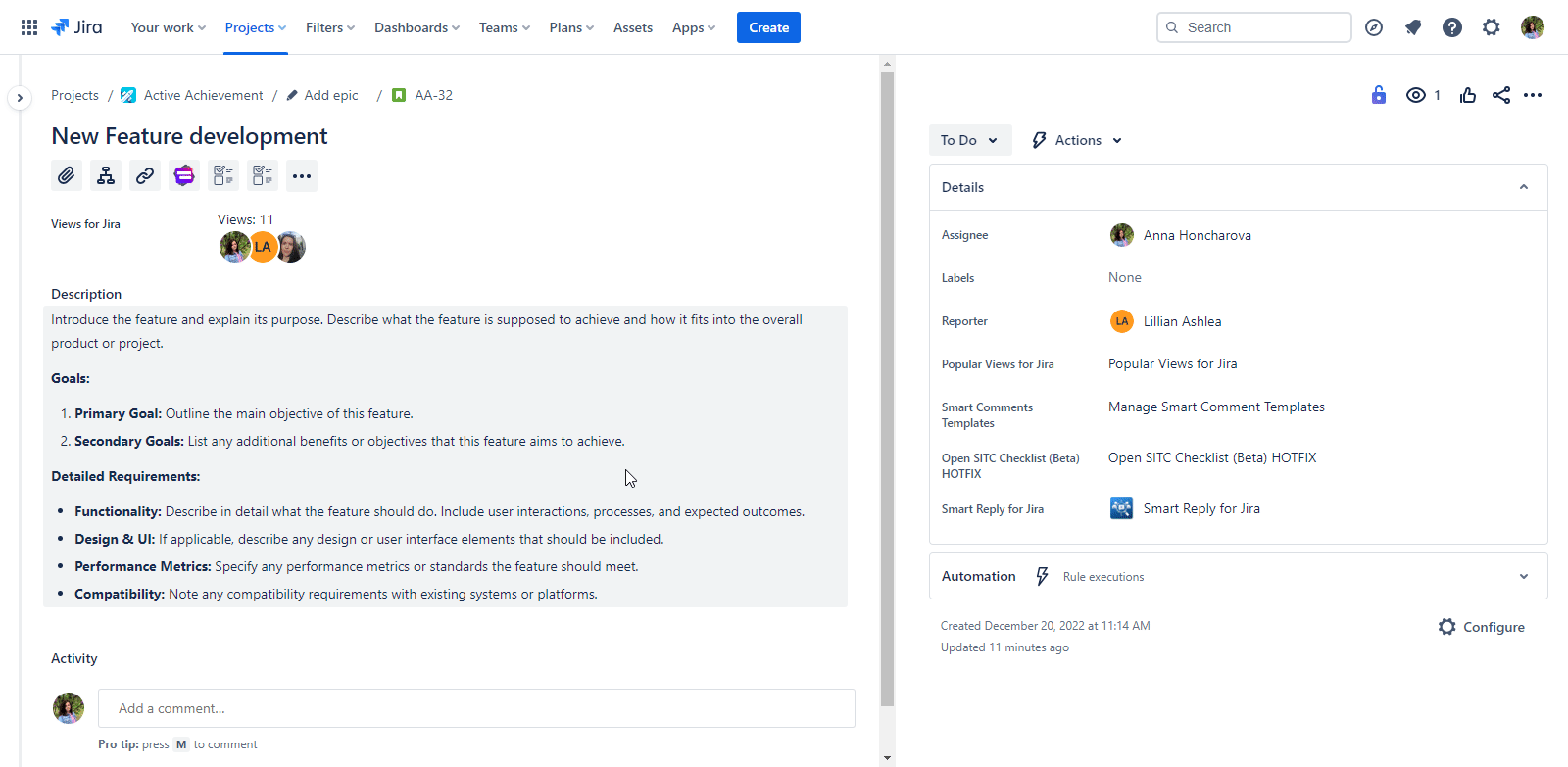 With the 'Views for Jira' custom field added, you can now enjoy detailed Issue View Analytics: